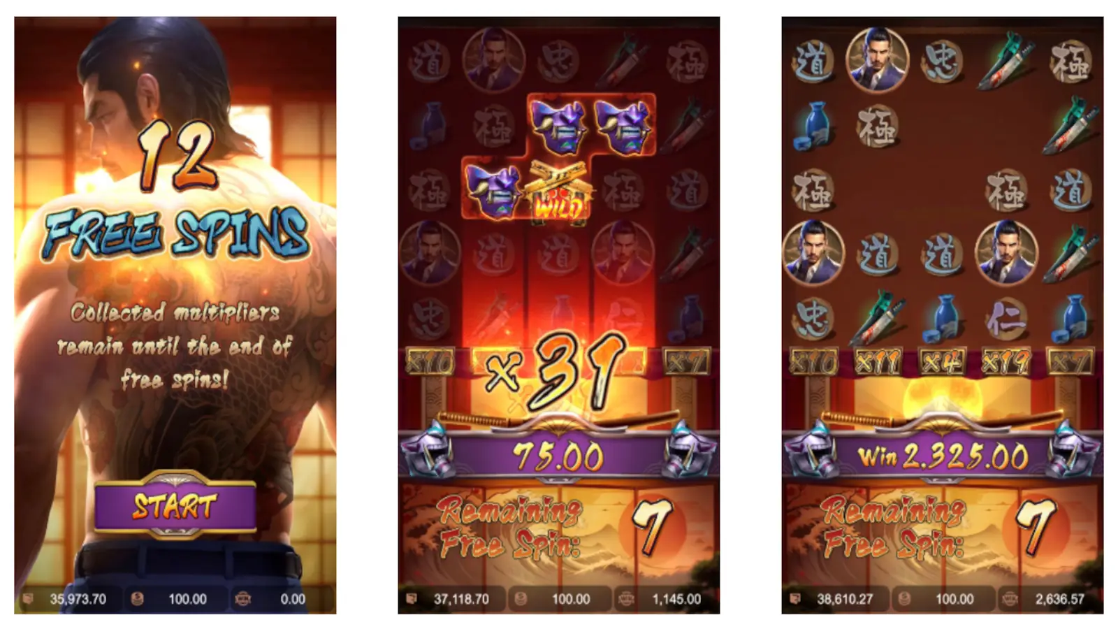 Quando 3 ou mais moedas douradas scatter aterram nas bobinas 1, 3 e 5, os portões do tesouro yakuza se abrem, concedendo 12 rodadas grátis preciosas. Cada scatter adicional além dos 3 iniciais adiciona 2 rodadas extra ao seu arsenal, como recrutar mais soldados para sua família.